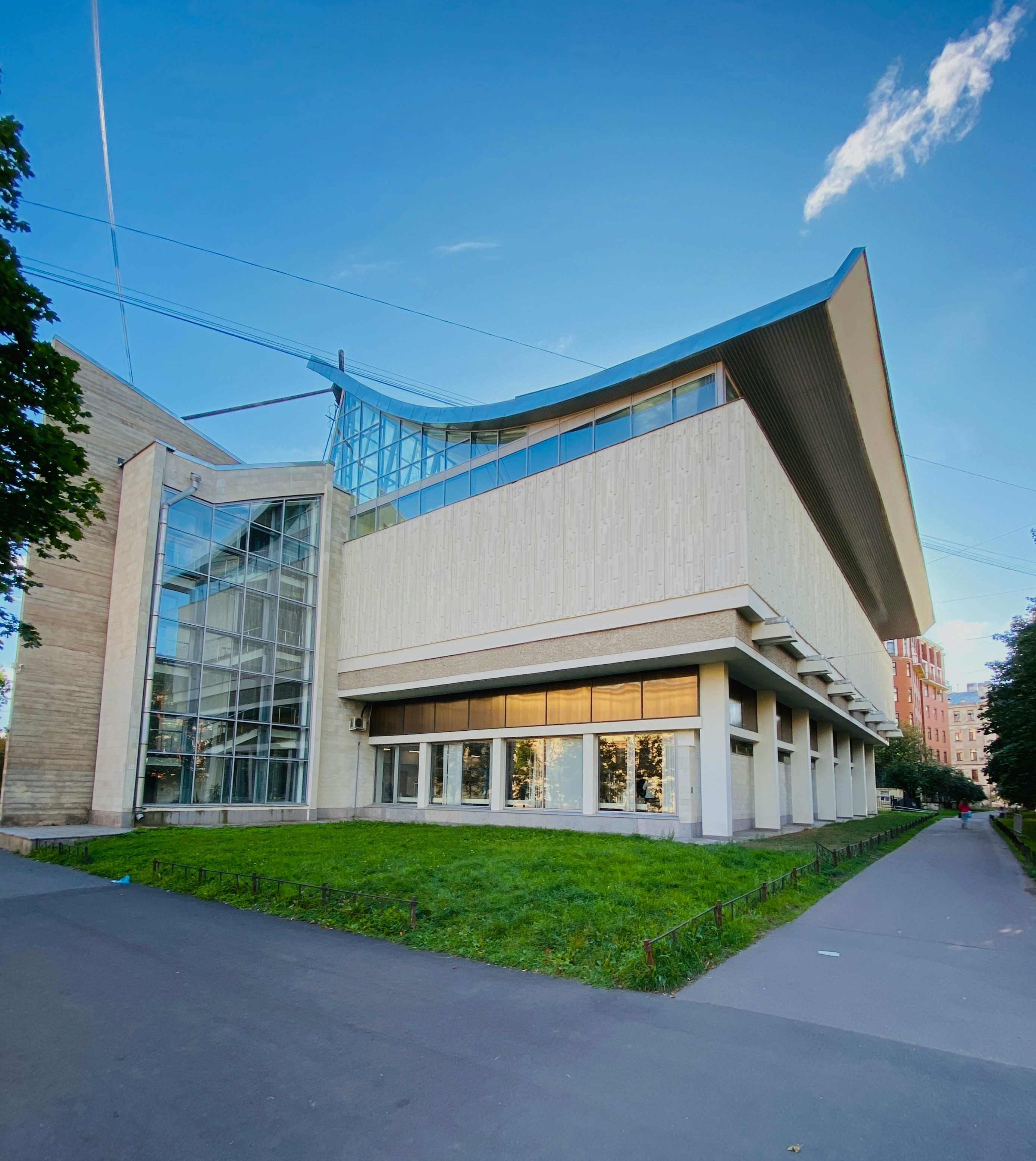 The striking, modern white and glass facade of the University of Alaska Museum of the North in Fairbanks, featuring a unique, wave-like curving roofline and sharp angles, representing the building's distinct architectural style. Spend time in this striking, modern museum. The building's architecture is designed to evoke Alaskan landscapes.