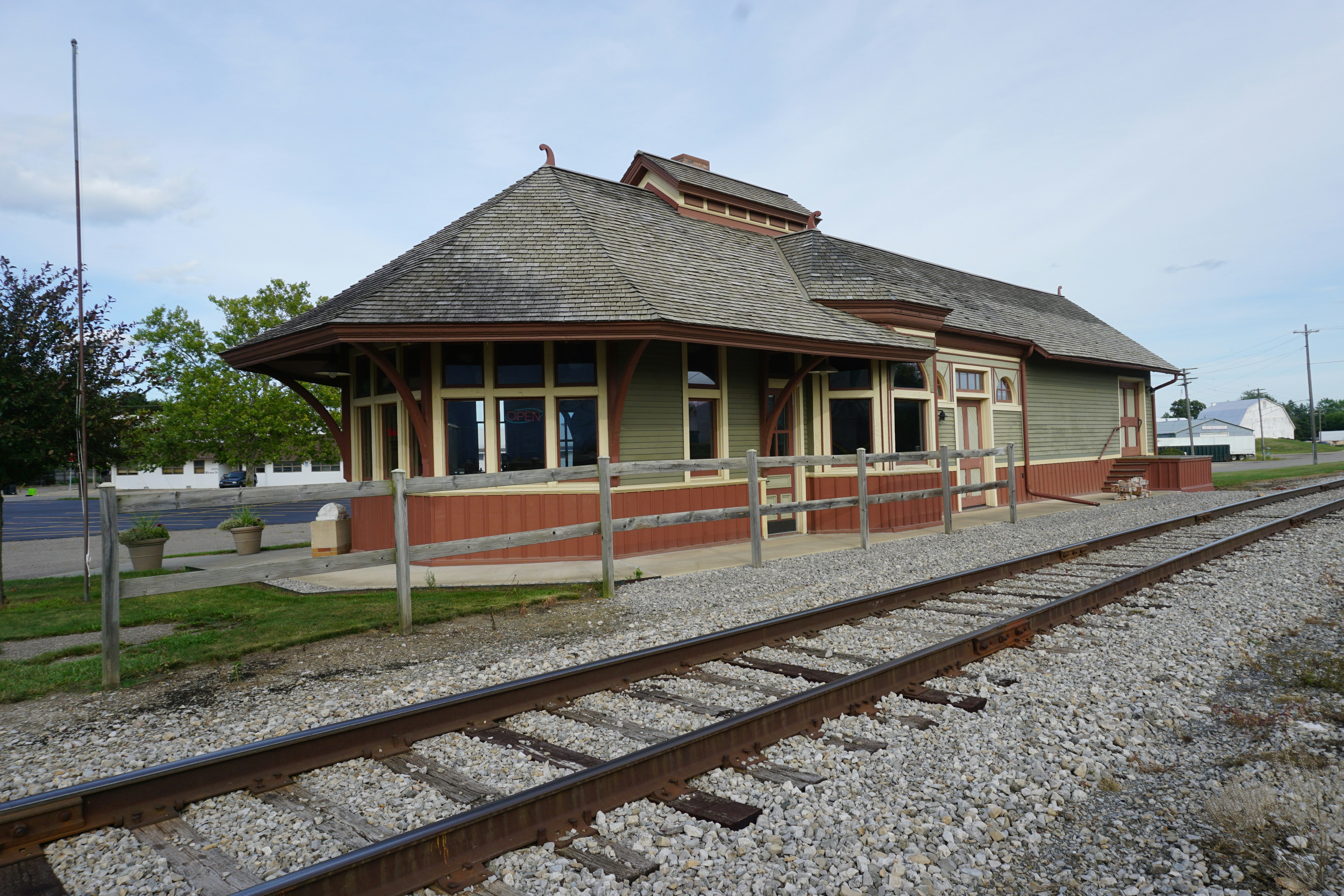 The historic wooden structure of a small railway depot with a broad, shingled roof and brown siding, viewed from across the active railroad tracks, representing the Tanana Valley Railroad Museum in Fairbanks. - Address:2300 Airport Way, Fairbanks, AK 99701, United States