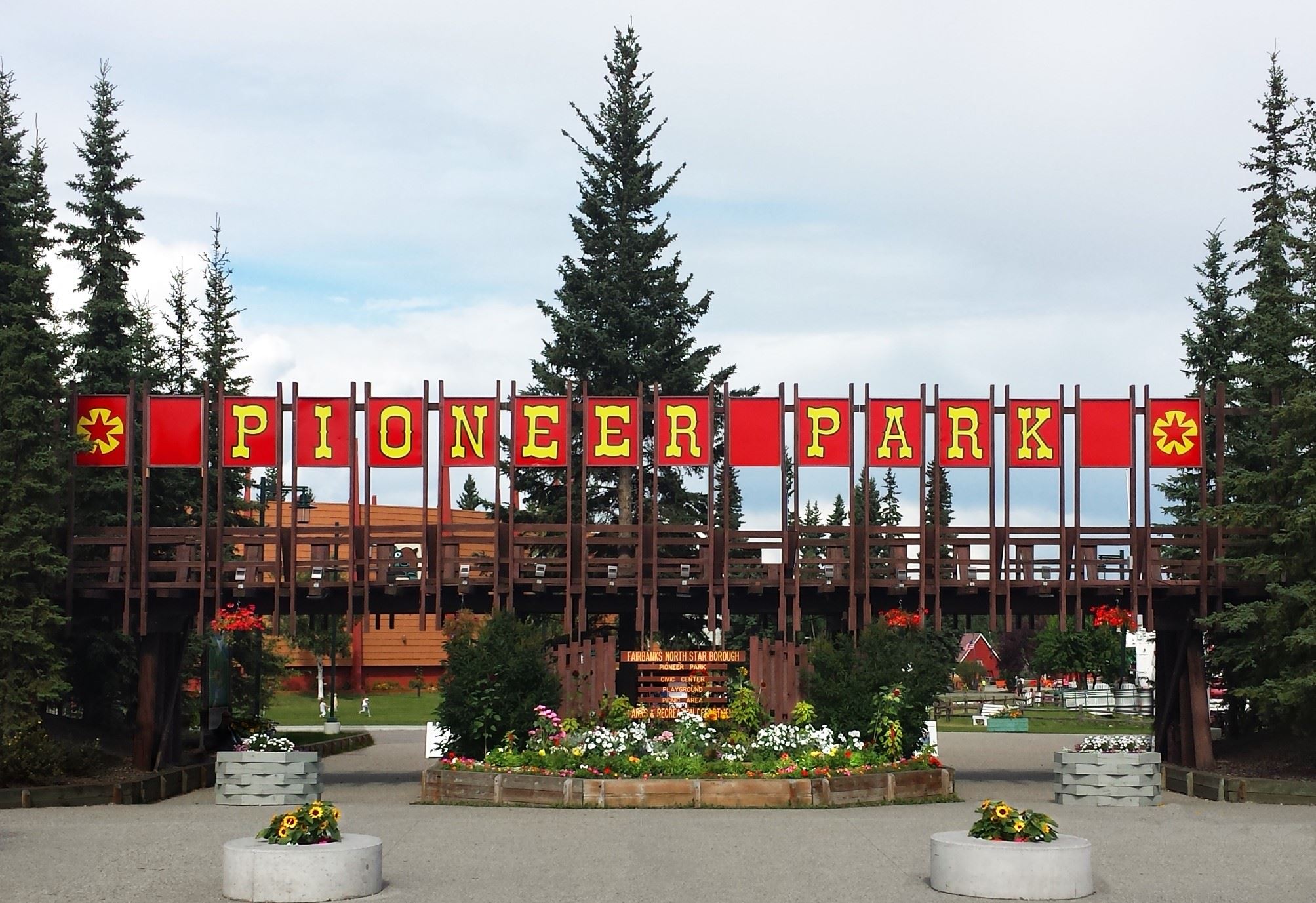 The main entrance sign for Pioneer Park in Fairbanks, Alaska. The Fairbanks North Star Borough Department of Parks and Recreation runs Pioneer Park, a 44-acre city park in Fairbanks, Alaska, USA.