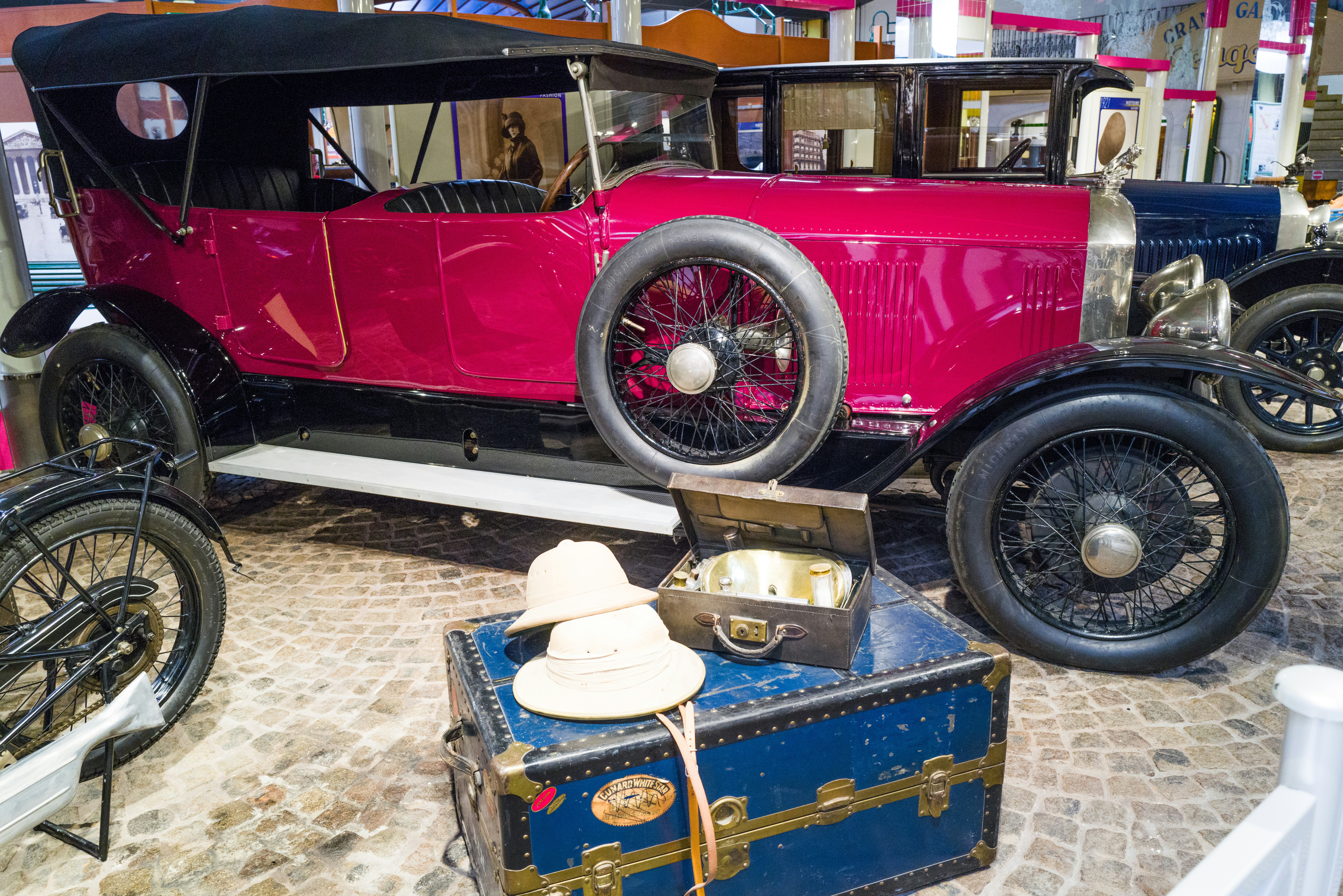 A restored, bright magenta 1910s-era antique touring automobile with a black convertible top, wire wheels, and a mounted spare tire, displayed indoors alongside a vintage blue steamer trunk and a pith helmet at the Fountainhead Antique Auto Museum. - Address:212 Wedgewood Dr, Fairbanks, AK 99701, United States