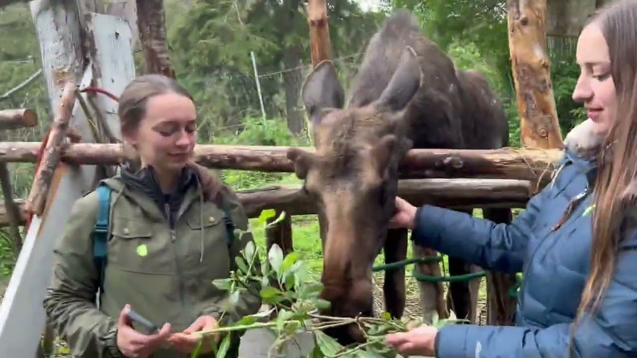 Two women gently offering branches to a moose through a wooden fence at the Kroschel Films Wildlife Center Kroschel Films Wildlife Center, located 23 miles northwest of Haines, offers guided tours and film presentations that bring visitors up close to Alaska’s animals. The center is home to orphaned and injured wildlife that cannot return to the wild.