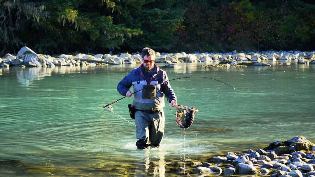 A fisherman wading in the Chilkat River, holding a fly rod and net with fish in it The Chilkat River is a great place for salmon and steelhead fishing, just a short drive from downtown Haines. Five types of salmon return here every year, so you can fish from May to October.