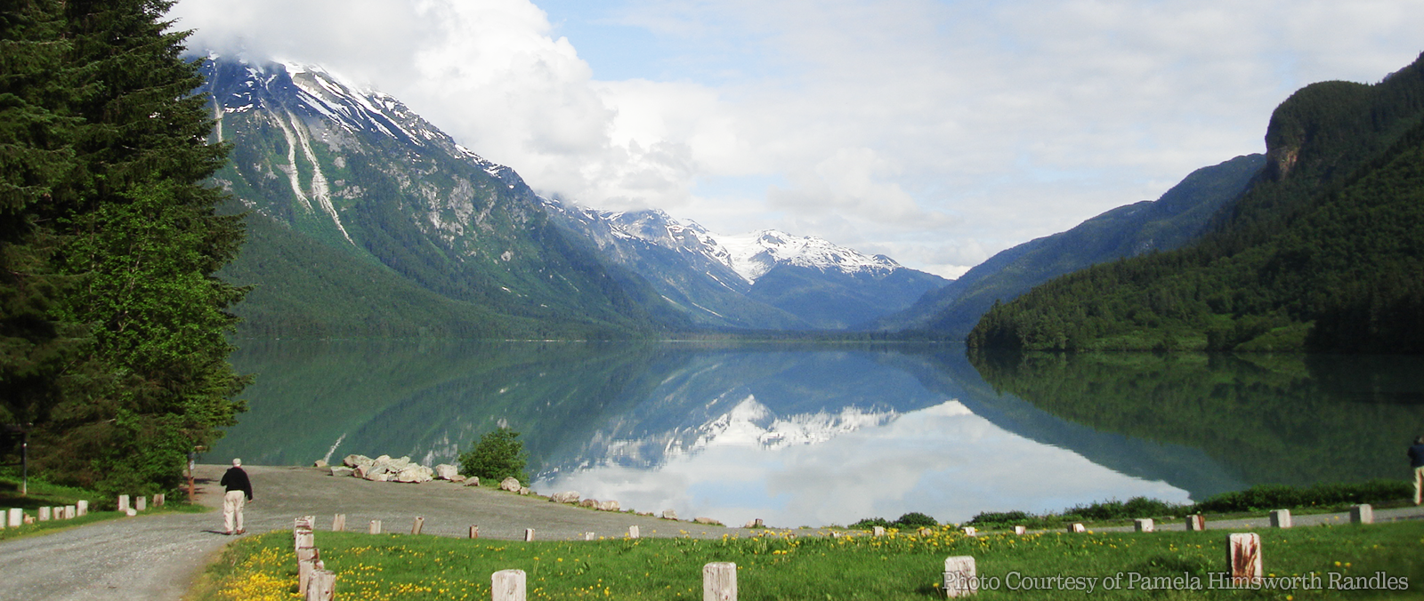 Chilkat State Park with a hiker walking near a still lake that mirrors the surrounding alpine beauty Chilkat State Park covers 9,300 acres of coastal wilderness just 7 miles south of Haines. Visitors can enjoy camping, hiking, and wildlife viewing while taking in views of Davidson Glacier and the Chilkat Inlet.