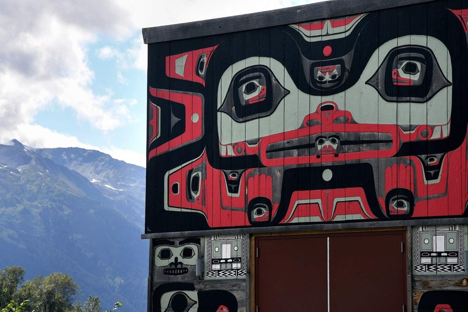 A colorful mural painted on the Jilkaat Kwaan Cultural Heritage and Bald Eagle Preserve building The Jilkaat Kwaan Cultural Heritage and Bald Eagle Preserve is a special place where you can see wildlife and learn about Native Alaskan culture. This facility is run by the Tlingit people and offers guided tours. These tours teach visitors about the traditional bond between the Tlingit people and eagles.
