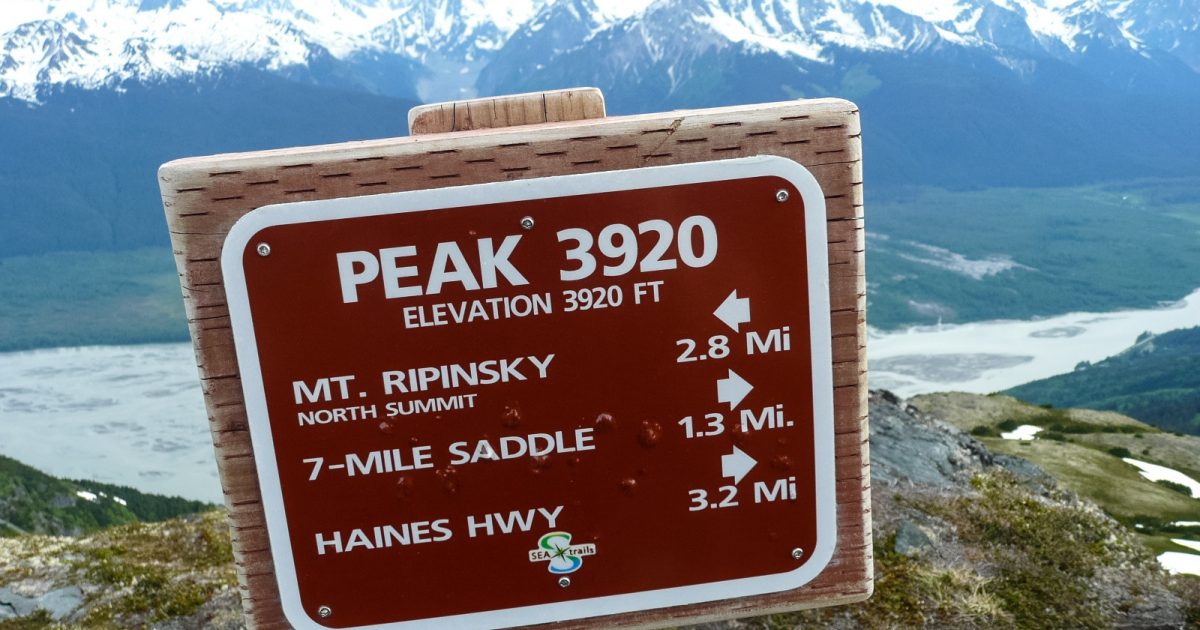 Wooden trail marker at Peak 3920 ft., pointing to Mt. Ripinsky, 7-Mile Saddle, and Haines Hwy The Mount Emmerich trail system has challenging hikes and beautiful mountain views. It is located south of Haines. The trail to 7 Mile Saddle climbs 2,000 feet over 3.5 miles. From there, you can reach more peaks and ridges.