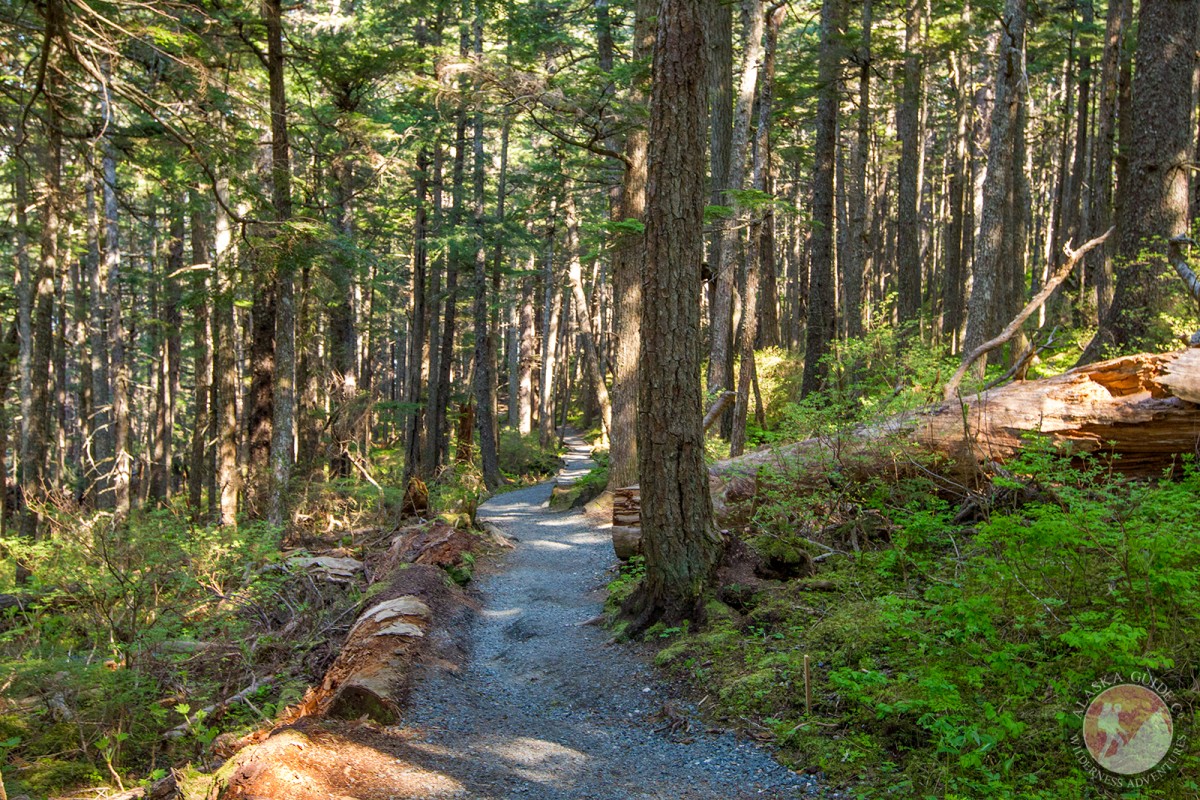 The Seduction Point Trail ends at a beautiful spot with amazing views of Lynn Canal and the Chilkat Mountains. During the summer, it's common to see whales, especially humpback whales, feeding nearby.