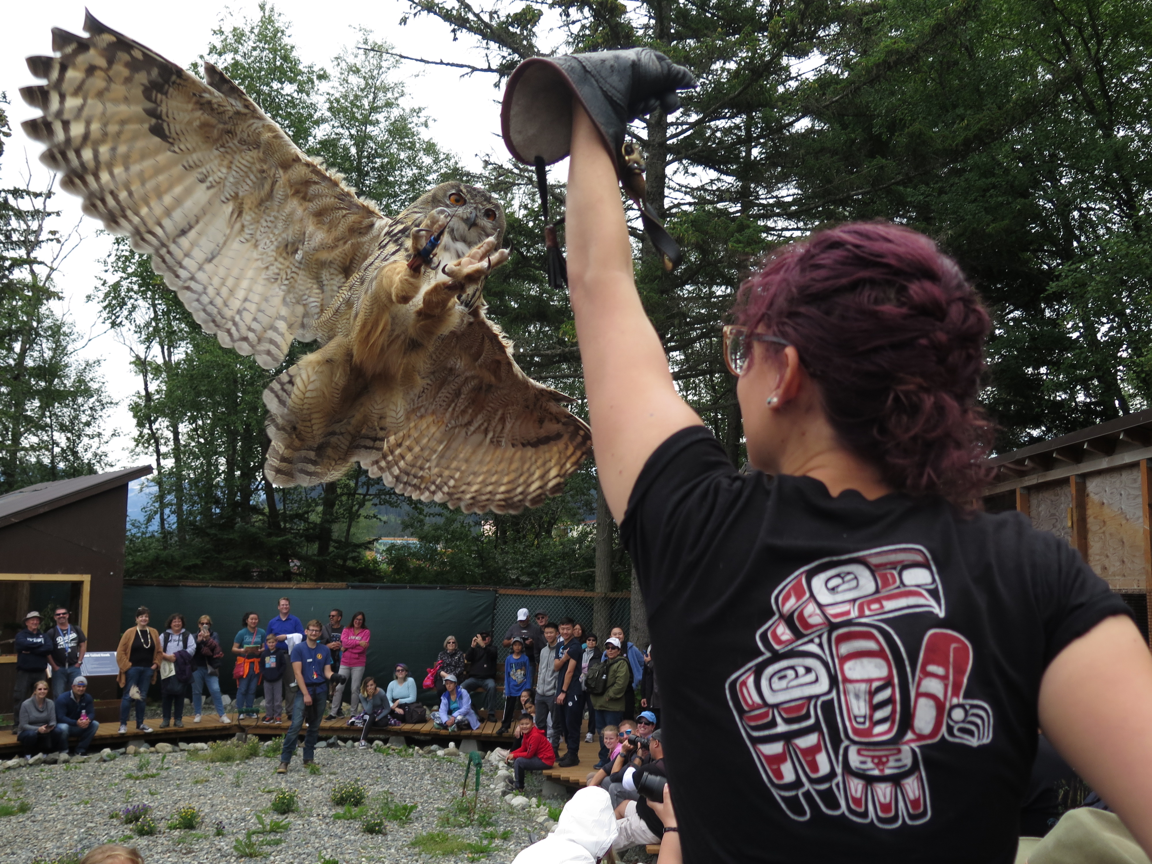 Educational bird show featuring a trained owl in flight, guided by a handler at the American Bald Eagle Foundation Museum The American Bald Eagle Foundation Museum in downtown Haines holds the world’s largest collection of bald eagle specimens and Alaska wildlife displays. More than 180 species are shown in realistic habitat dioramas.