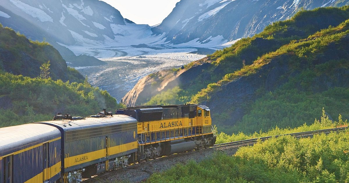 Hearing about this race helped me picture Wasilla in winter as a place where the cold is not a problem but a reason for adventure and community gatherings. While the Iron Dog takes place in winter, summer visitors will find plenty of things to do in Alaska in July, from fishing in Wasilla’s lakes to hiking in Hatcher Pass. Yellow and blue Alaska Railroad train traveling through a mountain valley with a glacier in the distance I visited the Alaska Railroad Depot in Wasilla and watched the train pull in. The depot offers summer service to Anchorage and Fairbanks, which makes the town an important stop along the route.