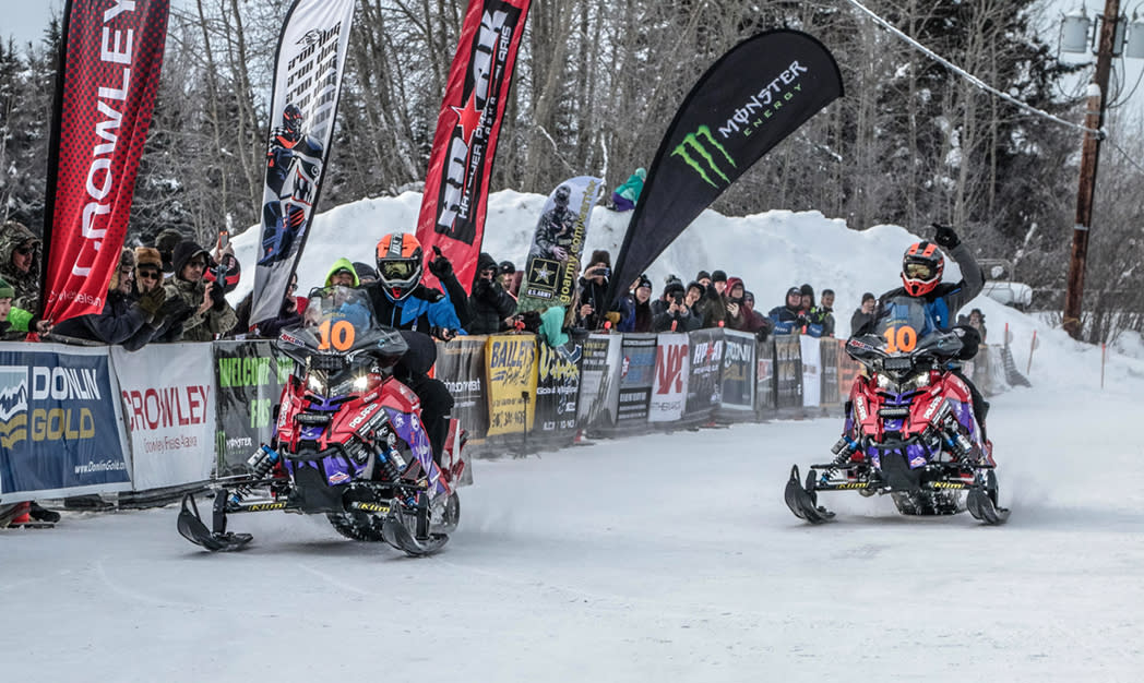 Two snowmobilers racing side-by-side at the Iron Dog Snowmobile Race, cheered on by spectators behind banners Even though I visited in summer, I learned about the Iron Dog Race which starts in Wasilla and stretches 2,031 miles to Nome and back. Locals told me how exciting it is, with the same kind of energy as a football tailgate but on snow.