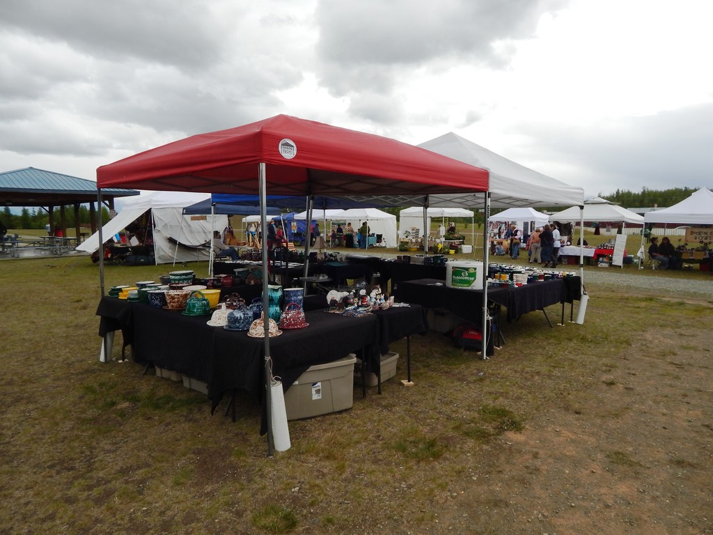 I loved that the park also offered camping which meant I could imagine staying overnight under the clear Alaskan sky. It was peaceful, and it made me appreciate the quiet beauty of the area. Walking through Lake Lucille Park made me think about the balance of the outdoors and community life here; one of the many pros and cons of living in Alaskathat locals experience every day. Red canopy tent at the Wasilla farmers market displaying handmade goods on black-clothed tables One afternoon I went to the farmers market at the Wasilla Museum and I was greeted by stalls of fresh vegetables and fruit. I enjoyed talking with the vendors and hearing about their work in the Mat-Su Valley which is often called Alaska’s breadbasket.