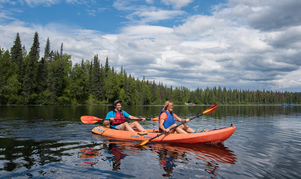 Man and woman paddling an orange kayak on a tranquil lake surrounded by evergreen trees For a calm escape, Wasilla Lake is the place to go. The still waters are perfect for a quiet paddle or a refreshing swim. The sight of mountains reflecting on the lake is unforgettable. Families will enjoy Newcomb Park and Lake Lucille Park, which both have non-motorized lake access, boat launches, and picnic areas.