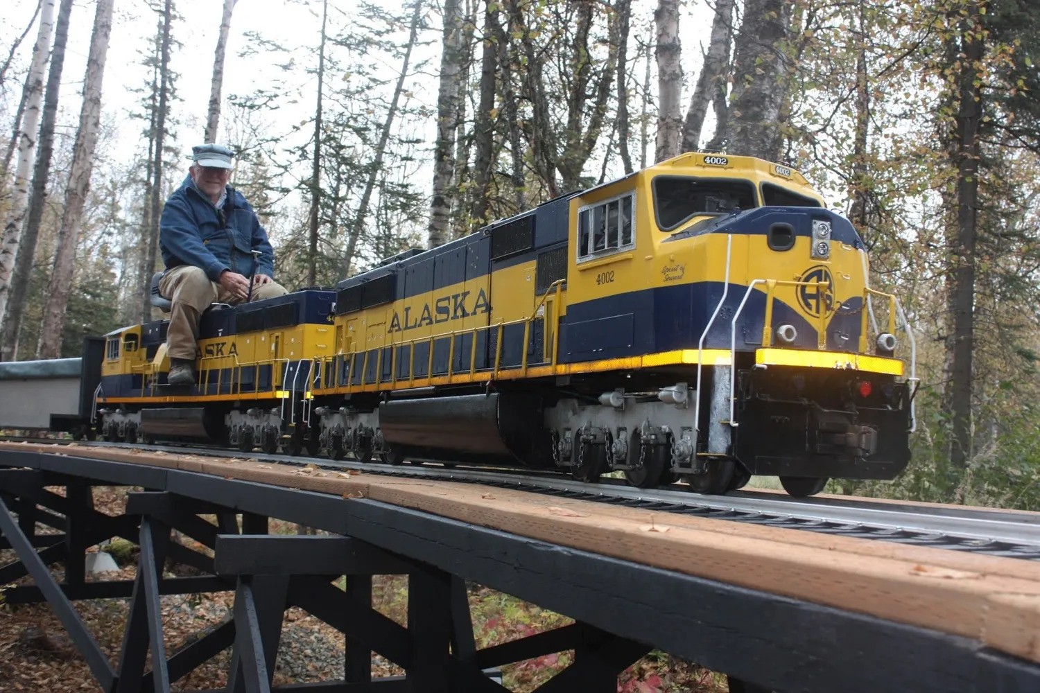A man riding a miniature train For a fun and unexpected stop, I visited the Alaska Live Steamers Museum. This small, volunteer-run attraction feels like a hidden gem that sparks the inner child in everyone. Riding a miniature train through the wooded grounds was both playful and surprisingly peaceful.